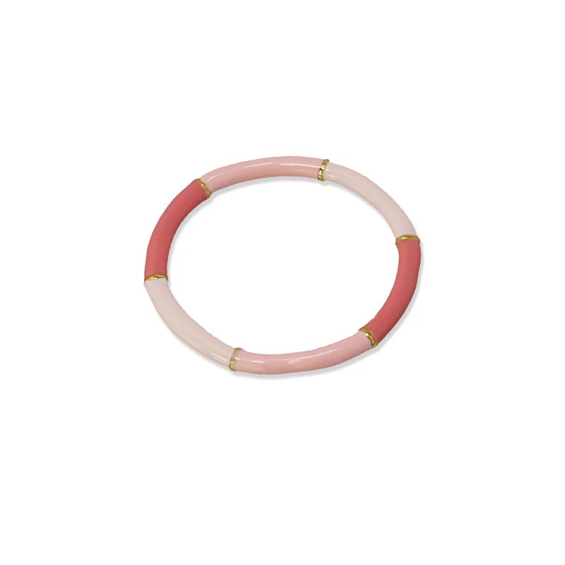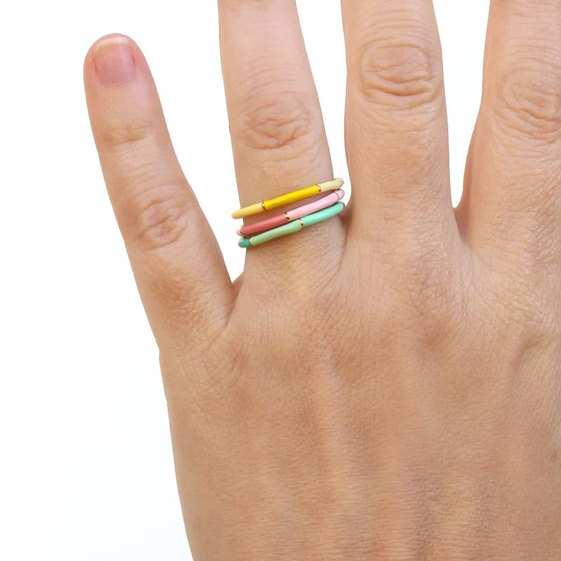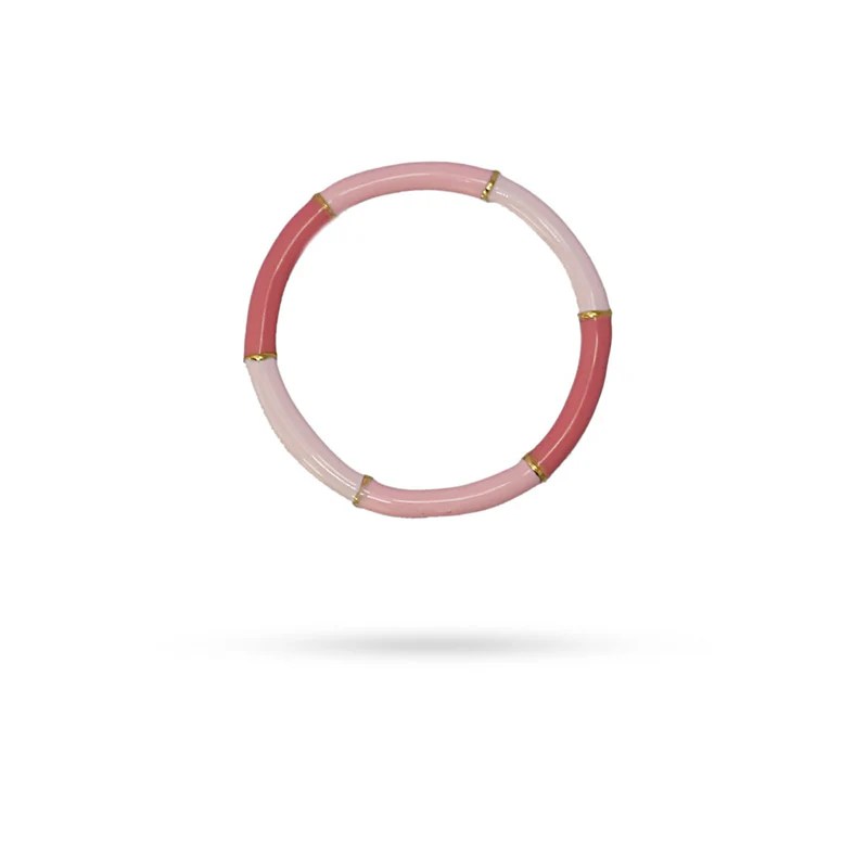 Anillo de acero fino con baño dorado y esmaltado en tonos rosas. Tallas disponibles de la 12 a la 16. Puedes combinarlo con sus argollas a juego. También queda precioso combinado con los otros dos colores, a modo de semanario.