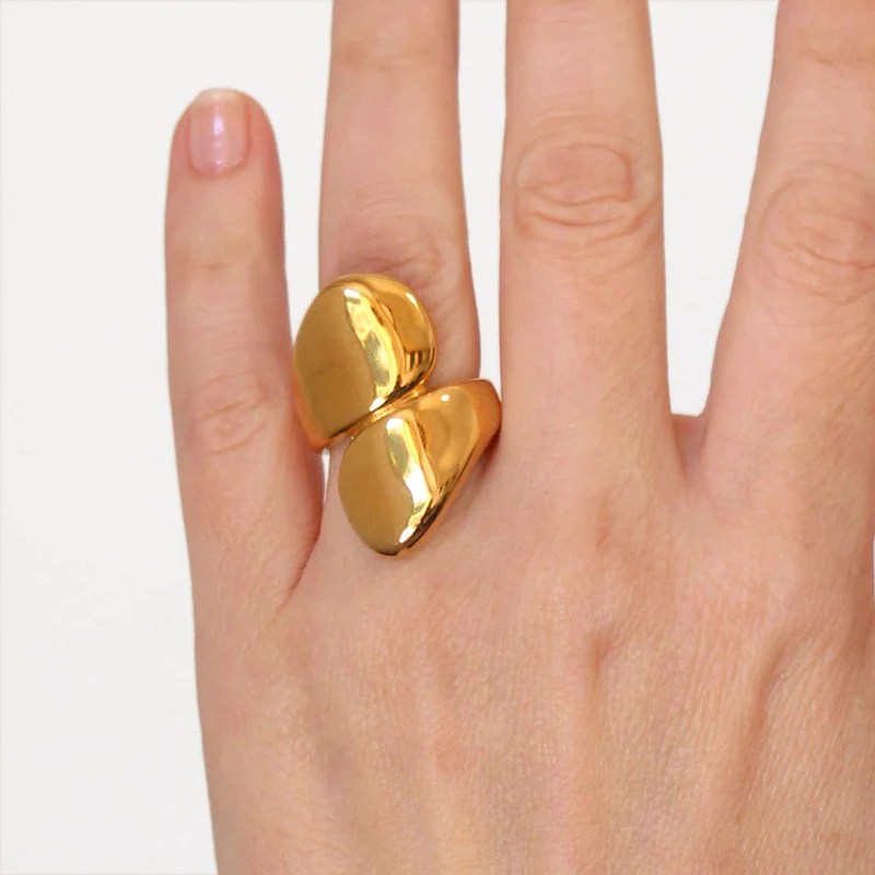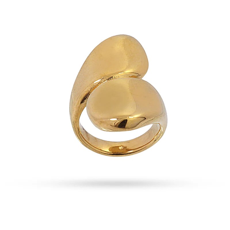 Anillo de acero dorado con diseño mazizo compuesto por 2 líneas cruzadas. Tallas disponibles: 14 y 16. Lúcelo solo o con otros anillos de la colección ESSENTIALS