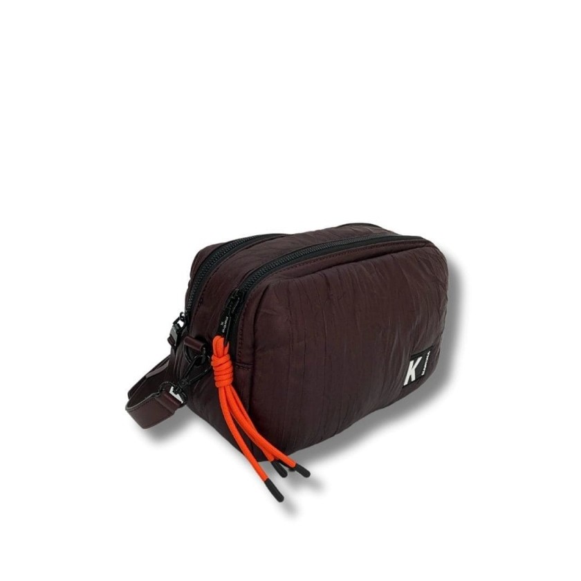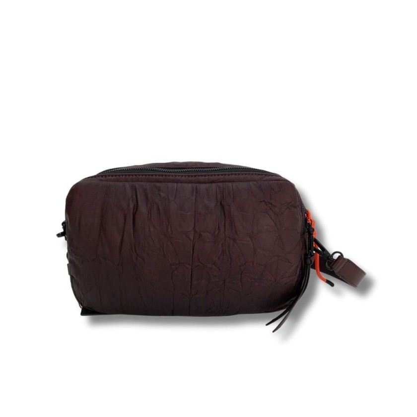Bolso rectangular suave con acabado arrugado en color burdeos o granate con asa larga para usar a modo de bandolera y doble cierre con cremallera. El interior está forrado y tiene un compartimento con cremallera.