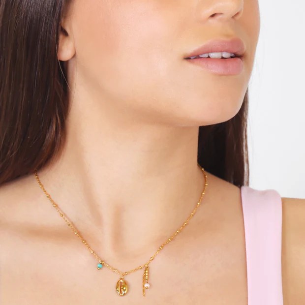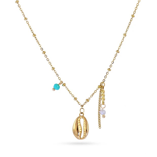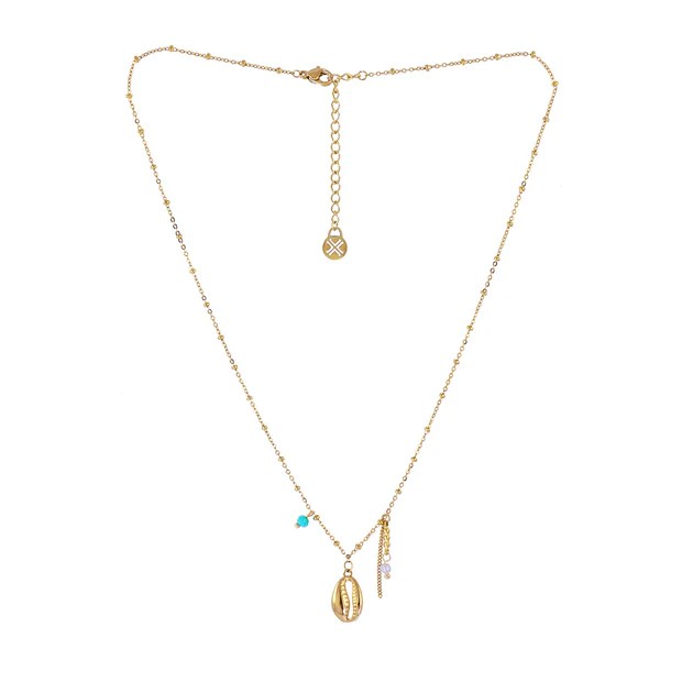 Collar de acero quirúrgico chapado en oro con cadena fina con bolitas alternas y pequeños charms variados, entre los que destaca una concha labrada. El cierre es un mosquetón y lleva incorporado un alargador.