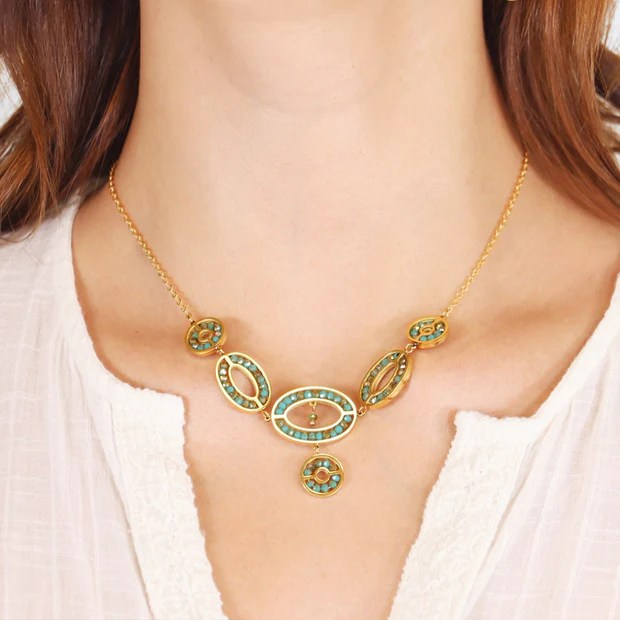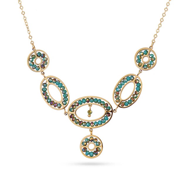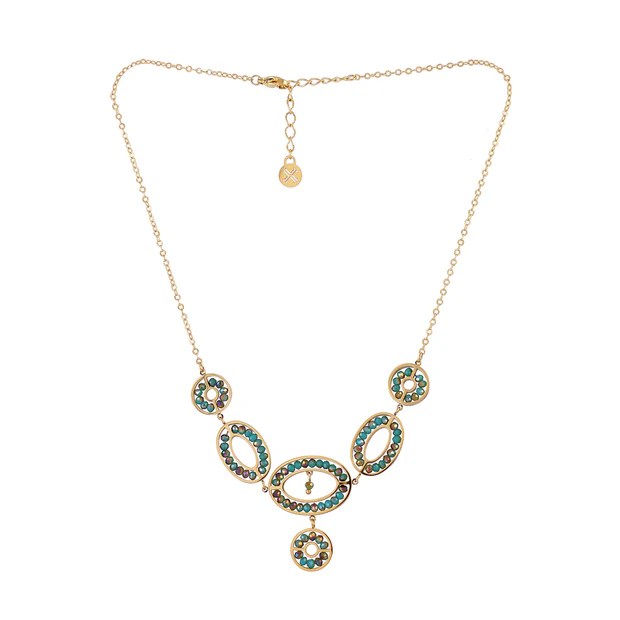 Collar de acero quirúrgico chapado en oro con cadena y piezas ovales con cristales incrustados en color verde turquesa. El cierre es un mosquetón y lleva incorporado un alargador. Puedes combinarlo con el brazalete o cualquier modelo de pendientes de la colección Sundust.