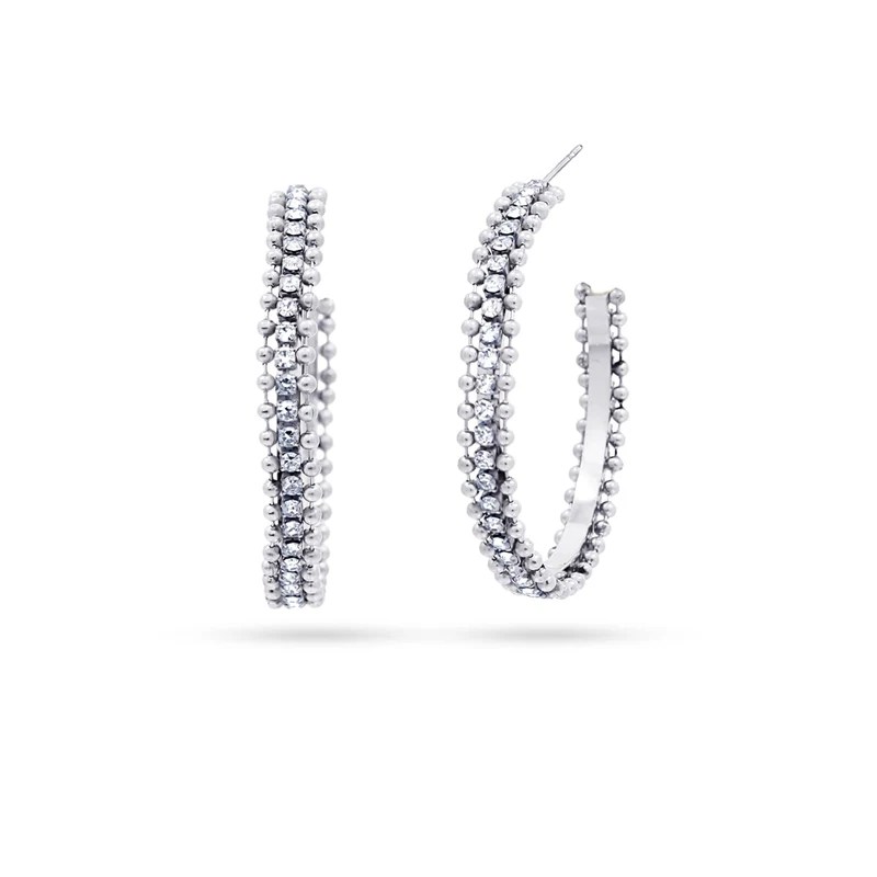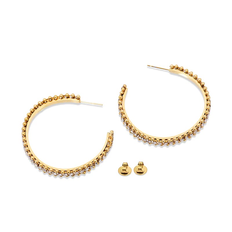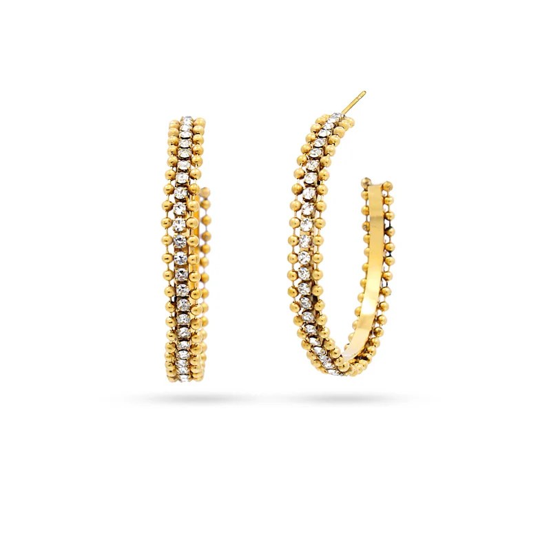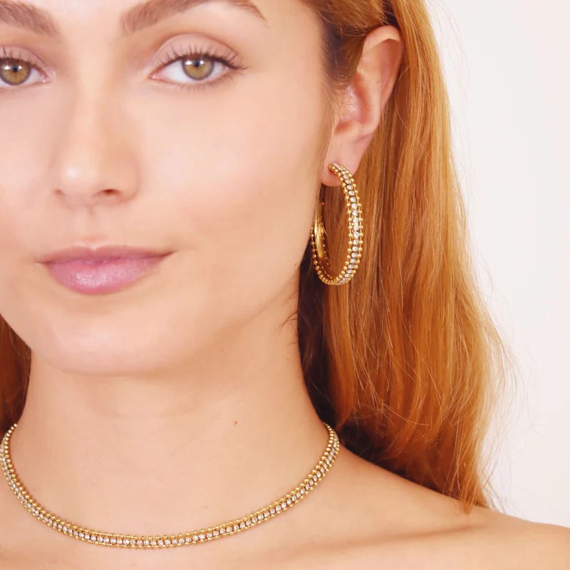 Argollas de acero quirúrgico dorado con diseño plano ancho rematado con circonitas. El cierre es un tornillo de presión. Son ligeras y muy elegantes. Puedes combinarlas con su collar o la pulsera a juego.