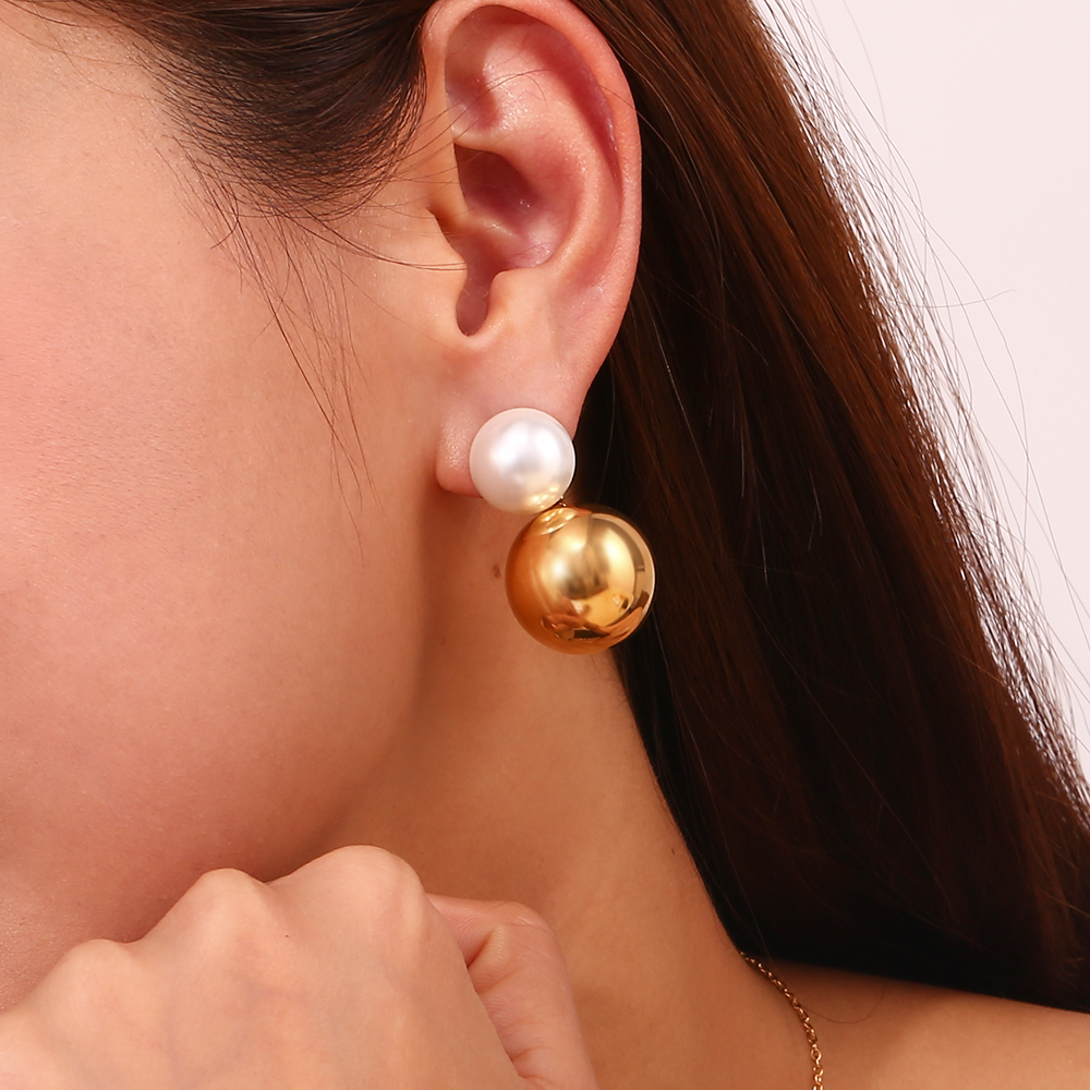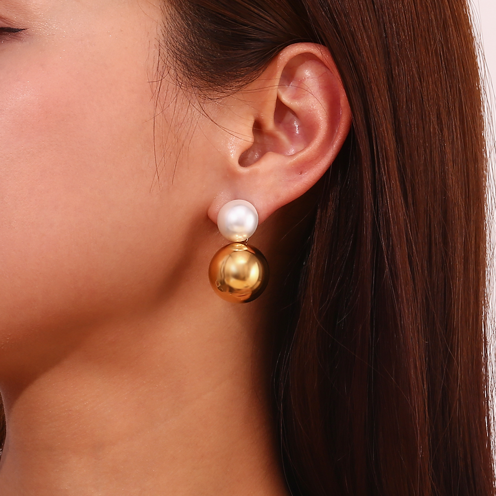 Pendientes de acero quirúrgico dorado formado por una bola dorada gigante y media perla en la parte superior. El cierre es un tornillo de presión. Son ligeros y muy elegantes, con un toque clásico.