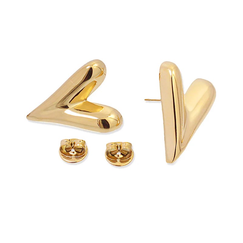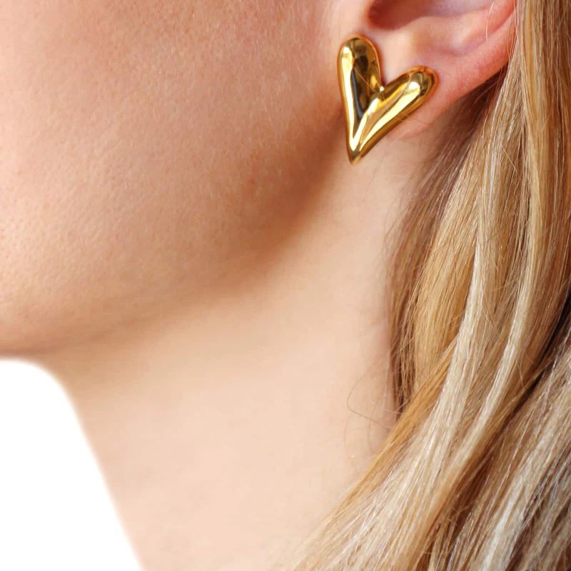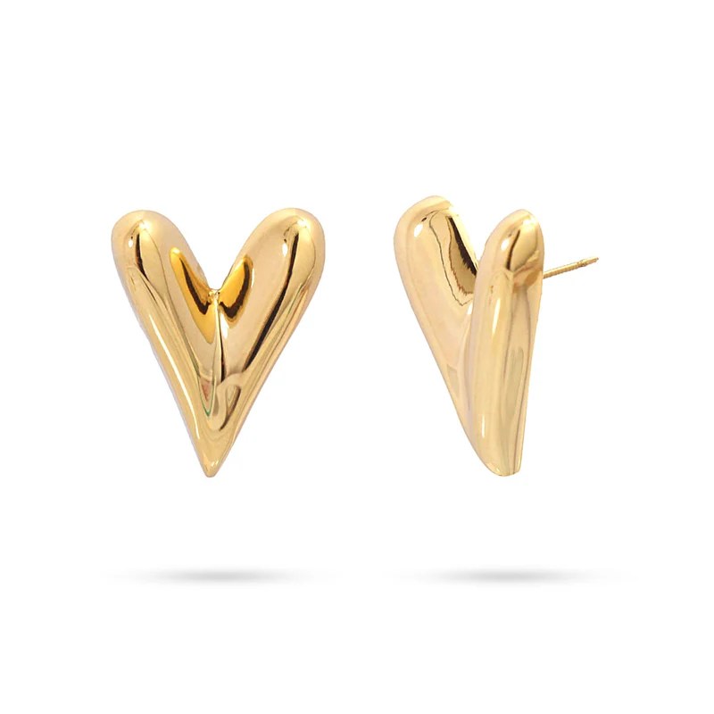 Pendientes de acero quirúrgico con baño dorado con forma de corazón gigante con acabado brillante. El cierre es un tornillo de presión. Son elegantes y muy ligeros, perfectos para lucir en el día día.