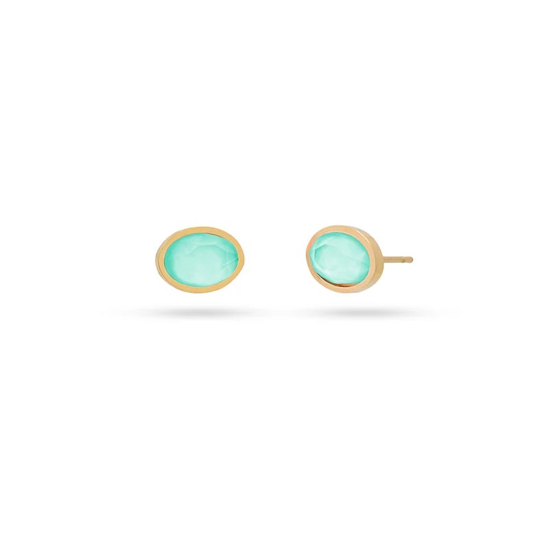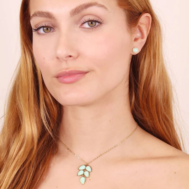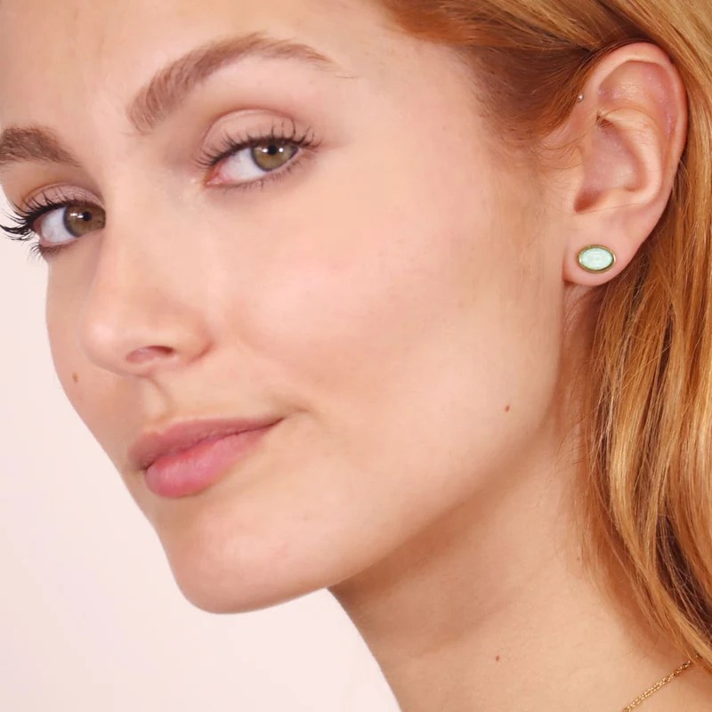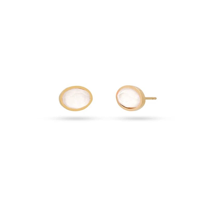 Pendientes de acero quirúrgico con baño dorado formado por un óvalo de cristal en color rosa pálido. El cierre es un tornillo de presión. Combínalos con cualquier pieza de la colección AQUA