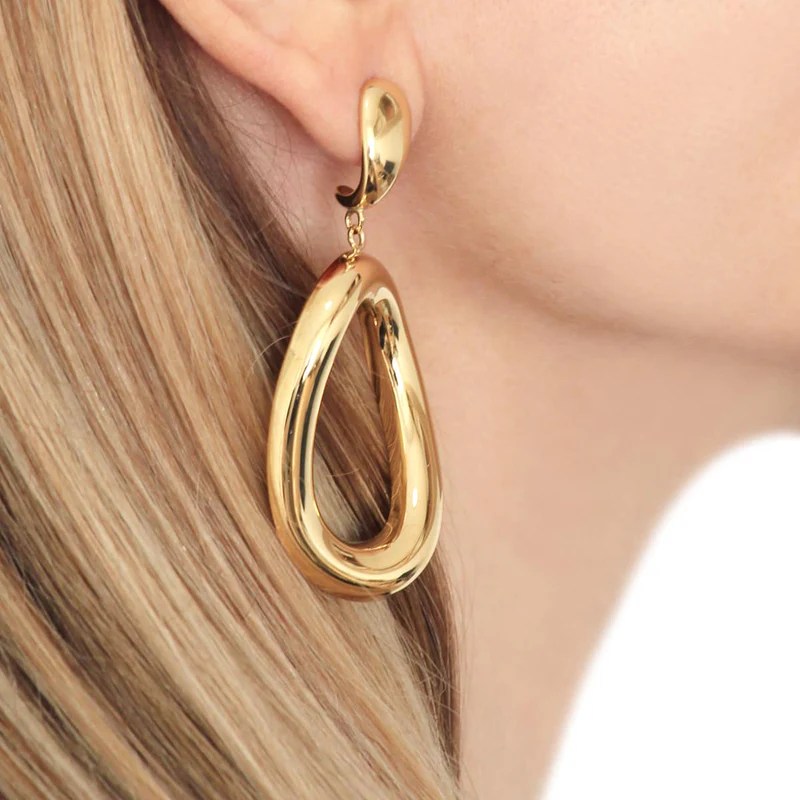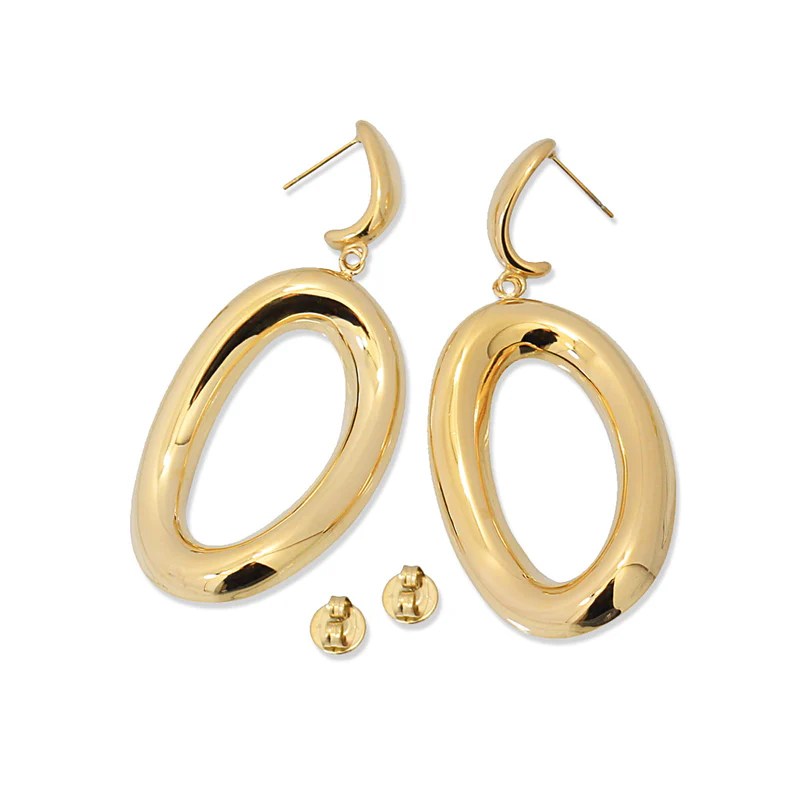Pendientes de acero quirúrgico con baño dorado formados por un palo y un óvalo hueco gigante con acabado brillante. El cierre es un tornillo de presión. Son elegantes y muy originales. Son ideales para tus estilismos más arreglados.