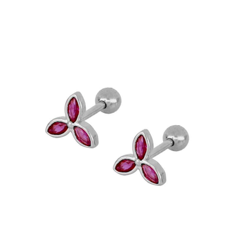Pendiente de plata bañada en oro tipo piercing con 3 pétalos de circonita fucsia formando una flor. El cierre es una bola de rosca y se venden por unidad. También está disponible en blanco y verde.
