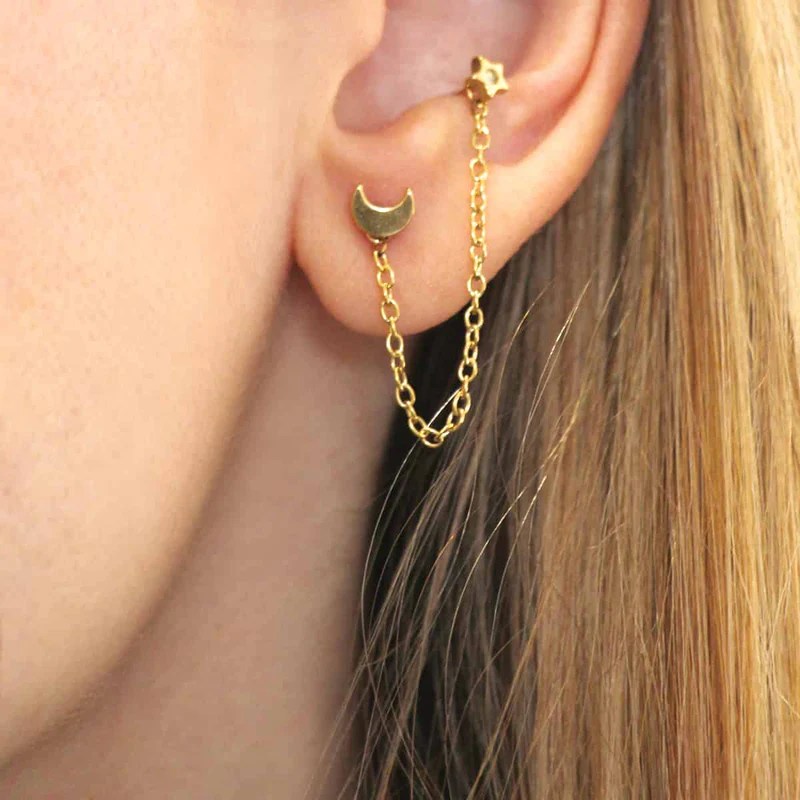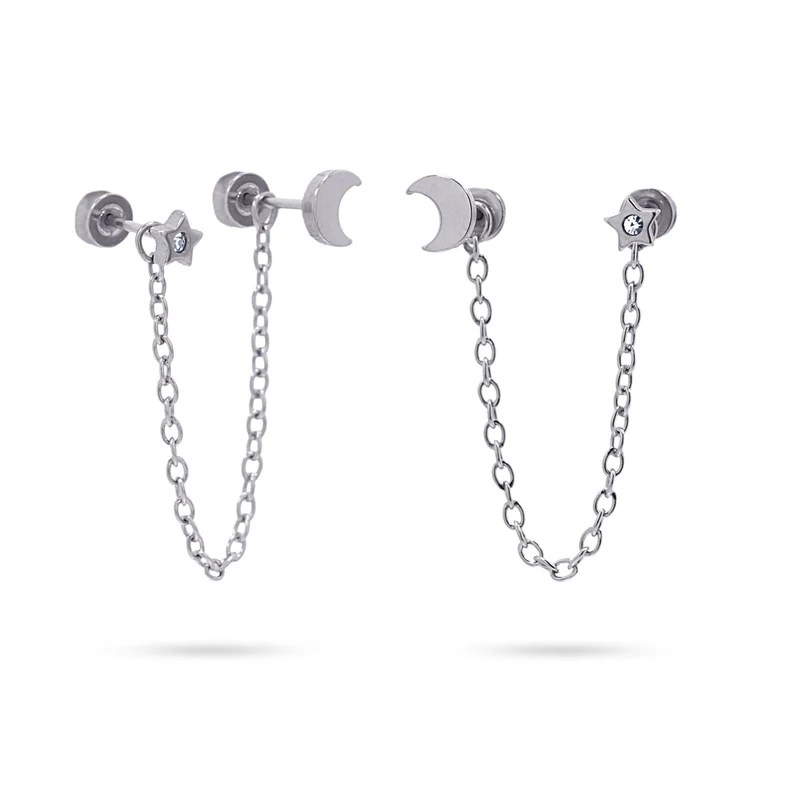 Pendiente piercing de acero quirúrgico doble formado por una estrella con circonita y una luna unidas por una cadena. El cierre es una bola de rosca plana y se venden por unidad. Es ideal para segundos y terceros agujeros y tiene el palo de 1 mm de grosor.