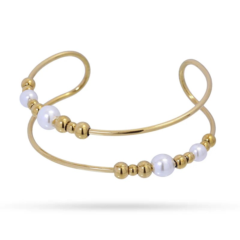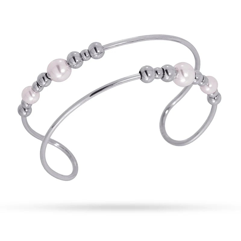 Brazalete de acero quirúrgico con dos líneas con perlas y bolitas engarzadas. Es ajustable, se adapta al ancho de la muñeca. Es elegante y delicada, perfecta para looks formales. Se puede combinar con el collar a juego y unos pendientes sencillos con perlas o bolitas de la colección ESSENTIALS.
