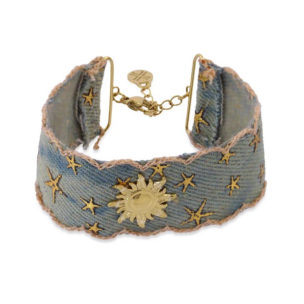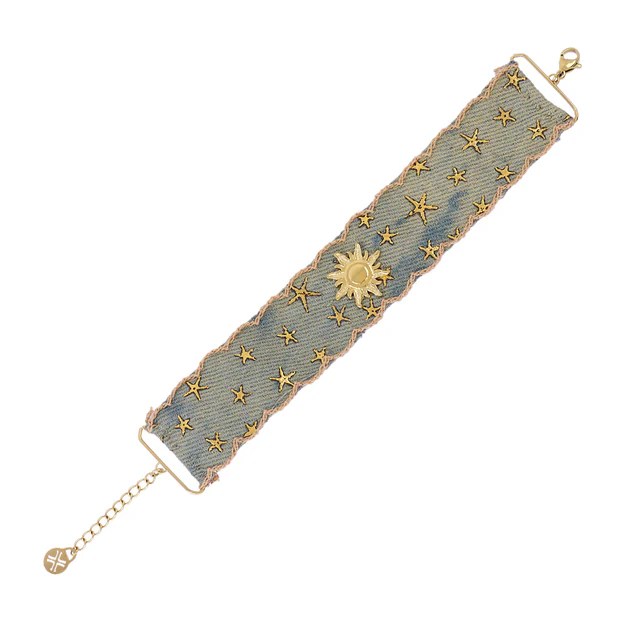 Pulsera de tela con detalles de acero quirúrgico, con cierre de mosquetón y detalle central con un sol y estrellas de mar bordadas. Es perfecta para lucir con tus looks más otoñales.